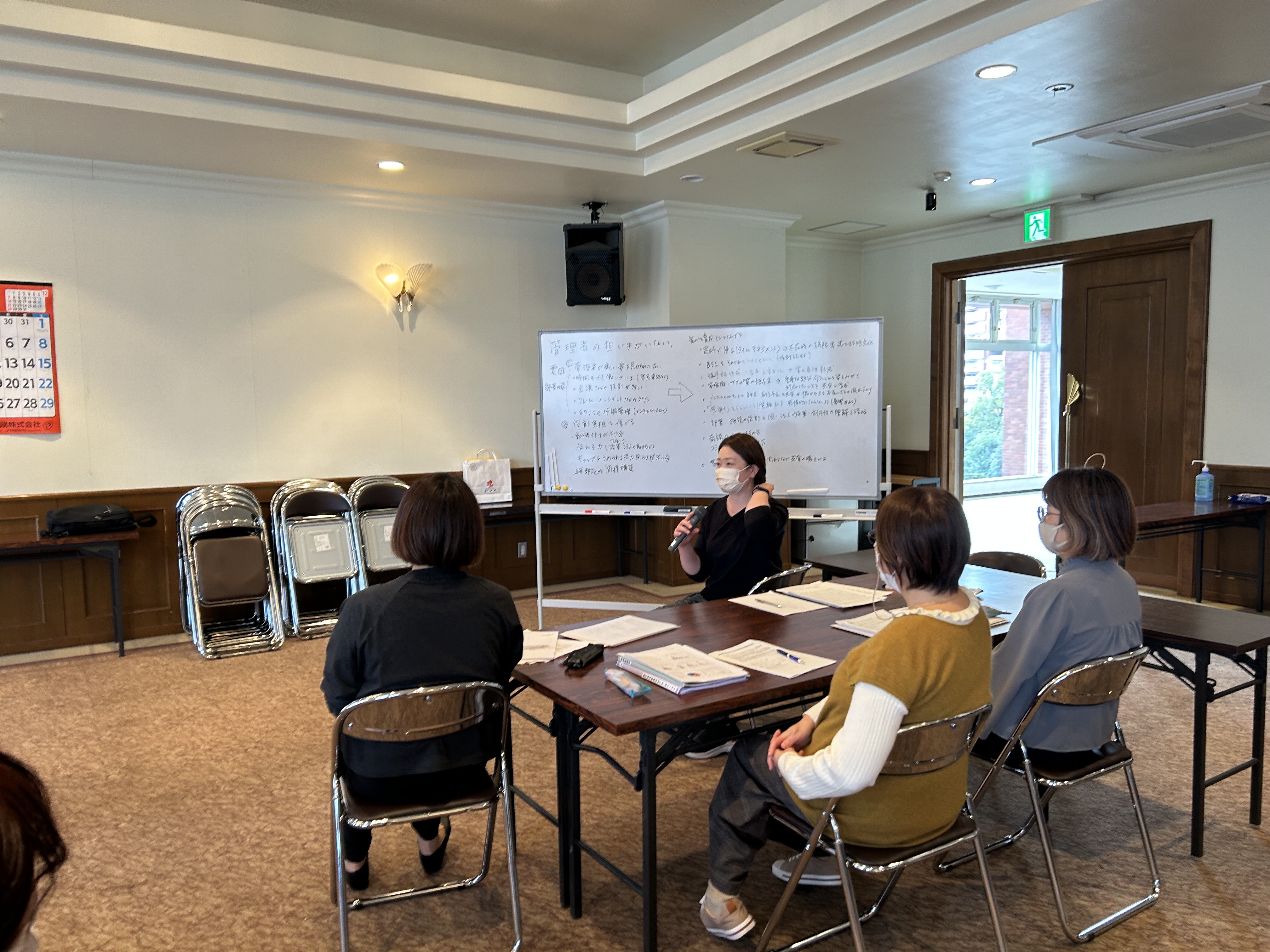 午後は、看護を通して気がかりな場面、心に残った場面、対応に困った場面など、自己の事例のまとめを活用して、午前中の学びをもとにグループワークを通じてディスカッションを行いました。ワーク後の発表では患者さんの今までの生活背景を知った上で看護に繋げていくことが重要だと実感した、改めて患者情報を4つの側面(身体面・精神面・社会面・スピりチュアルの面)で整理することで情報が偏っていたことがわかった、全ての側面から情報を整理して、初めて一個人としての患者の人物像が見えてくるということを学んだ等の学びが報告されました。研修全体を通して、笑顔で患者の目を見て、よく話しを聞いて、この看護師なら自分の気持ちを話せると思える看護師になれるよう関わりたいという反応が多数ありました。