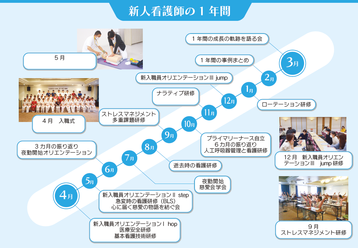 慈愛会では職員としての役割意識を高め、職場適応を支援するために新入職者オリエンテーション研修を3回(入職式後、5月、12月)実施しています。