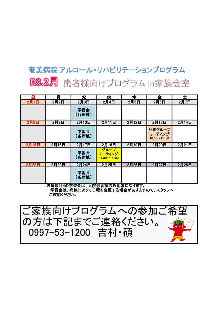 2月のアルコール・リハビリテーションプログラムを更新しました。