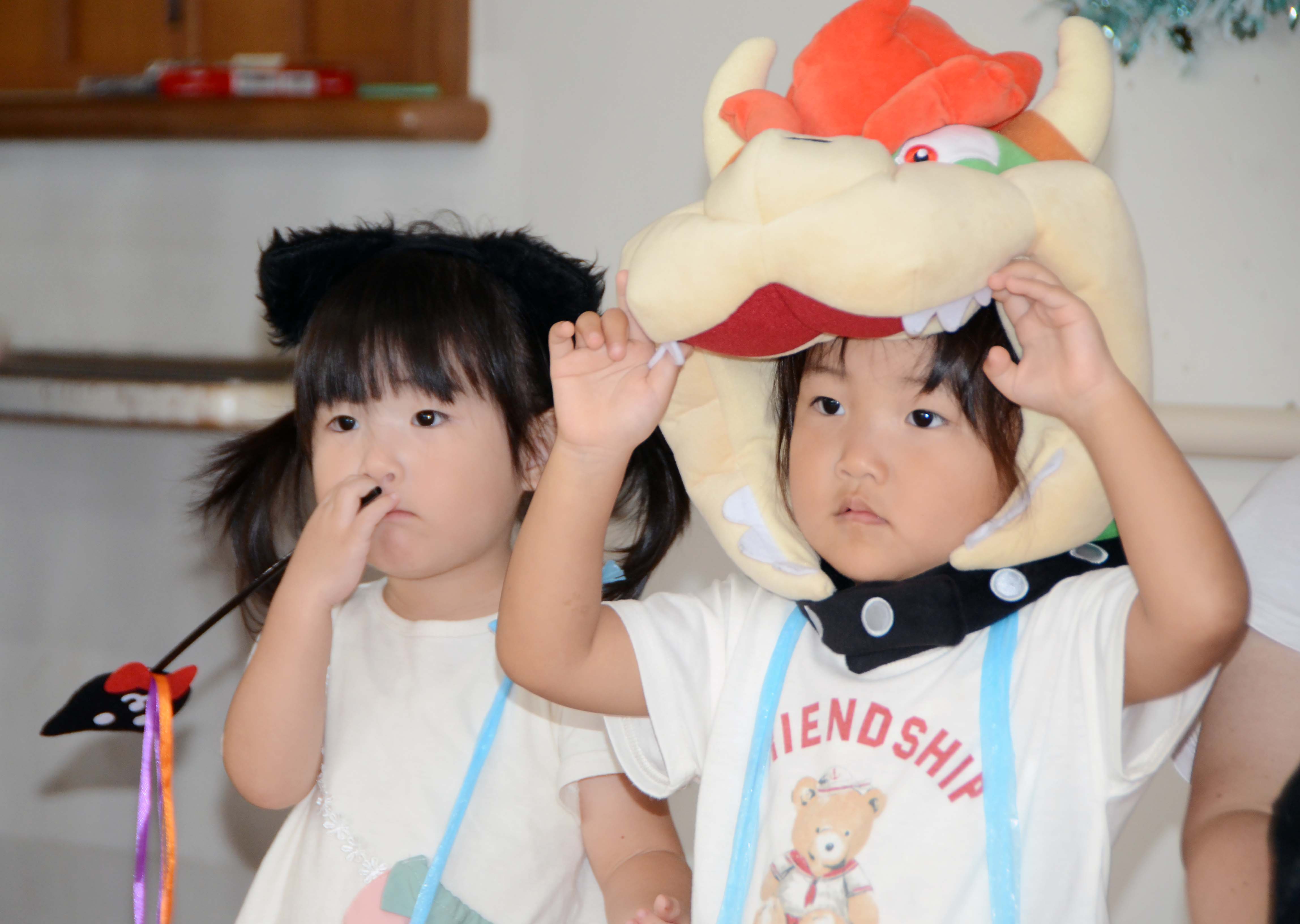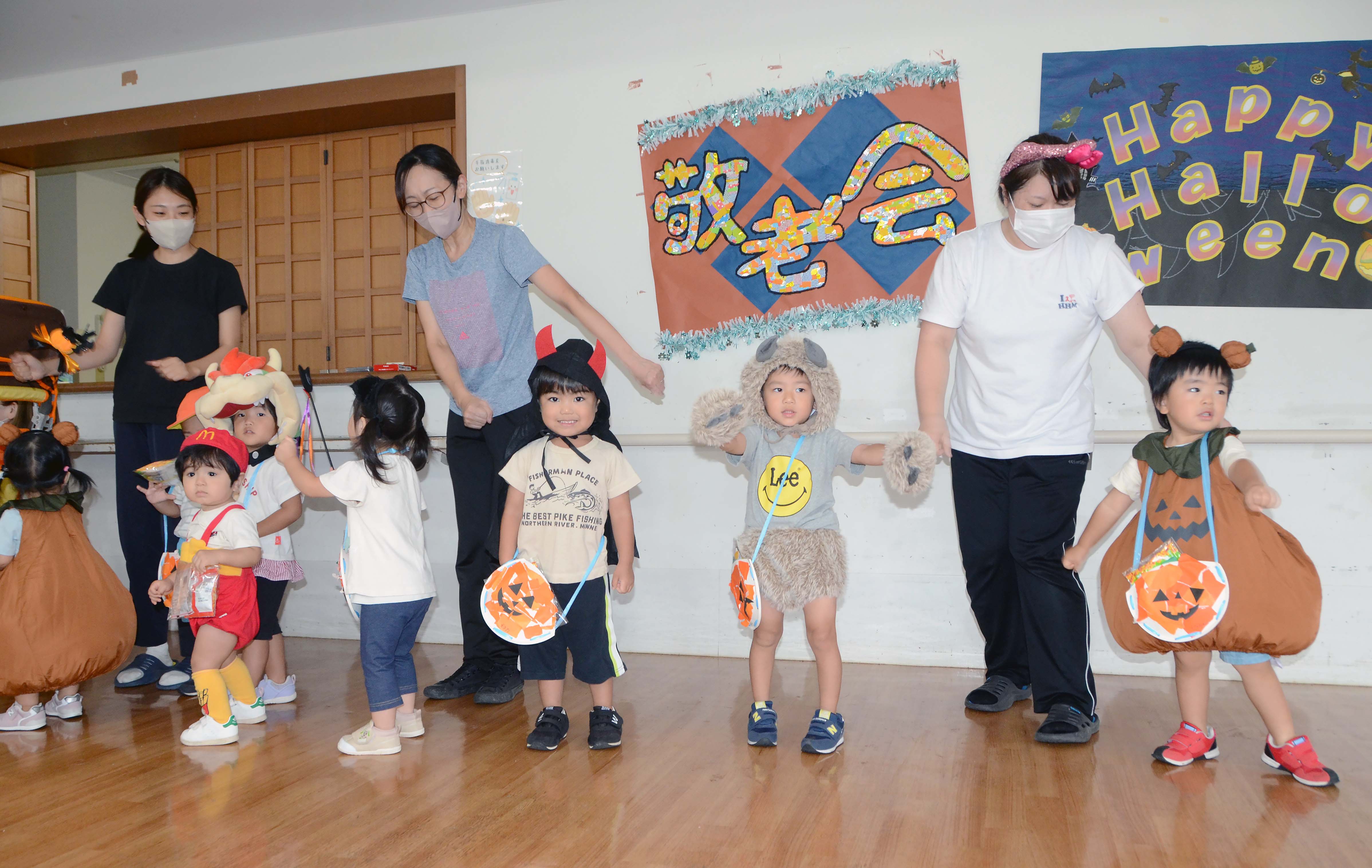 園児たちはハロウィンにちなんだ仮装で登場し、「Trick or Treat。お菓子くれなきゃいたずらするぞ」とアピール。