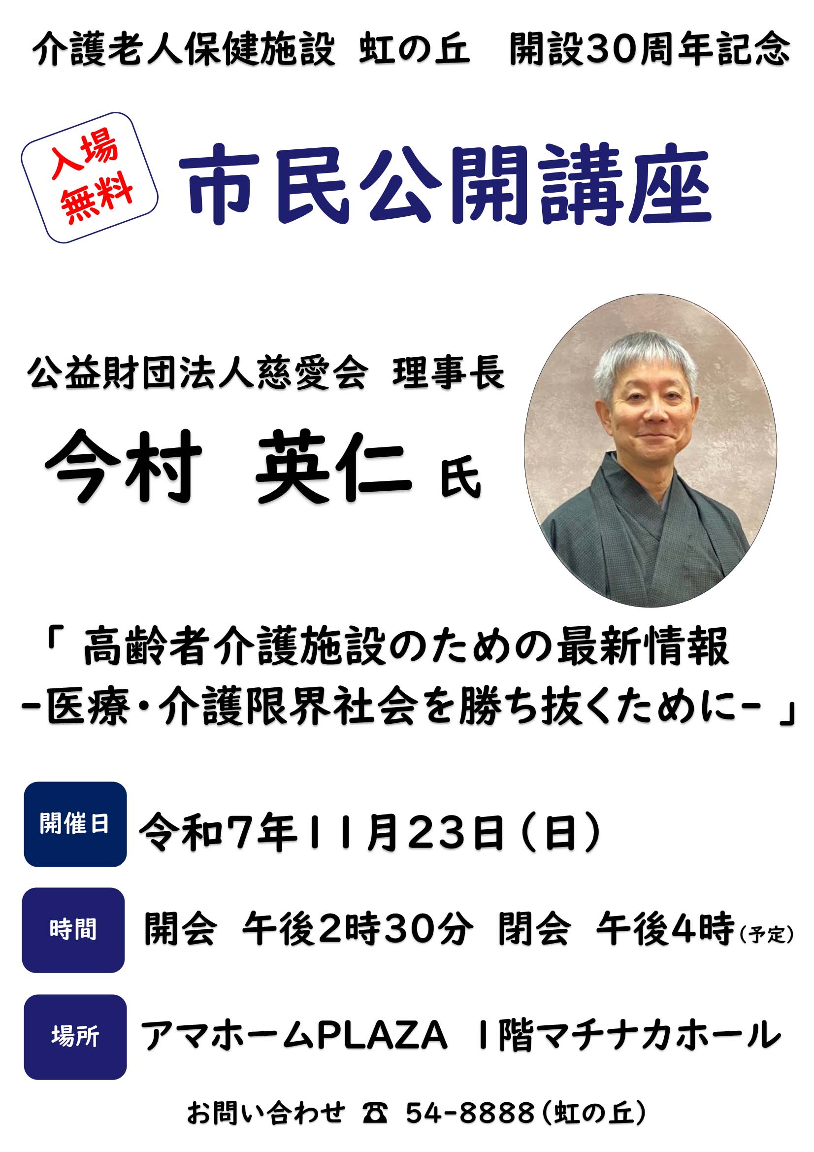介護老人保健施設 虹の丘 開設30周年を記念し、市民公開講座が2025年11月23日(日)に開催されます。
