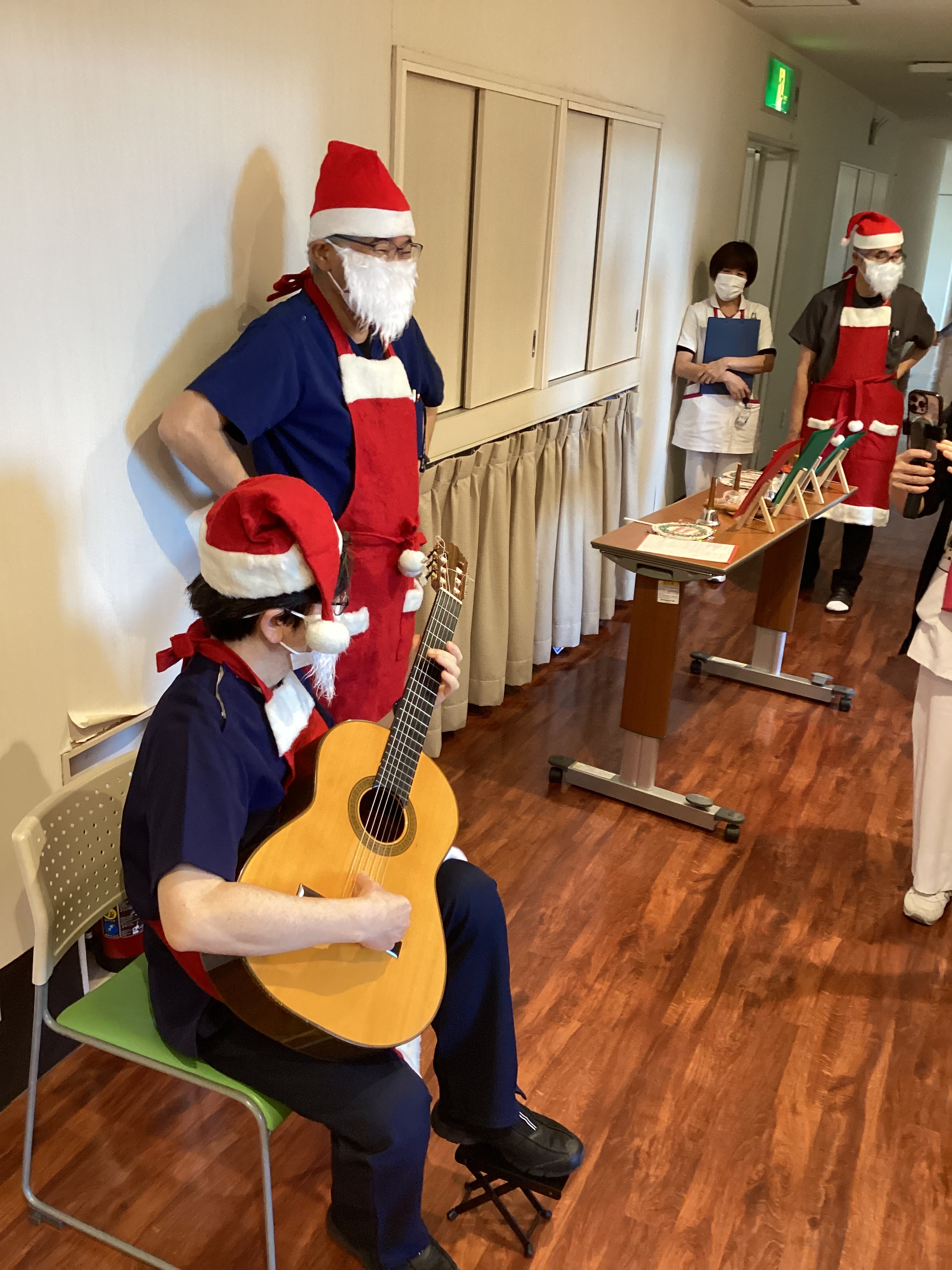 スタッフが患者様に少しでも楽しんでもらえるようにと、数週間前から準備に取りかかりました。患者様一人一人にメッセージを書いた手作りのクリスマスカードをご用意し、スタッフによるハンドベルの演奏、そして米田先生のギター演奏が披露され、患者様やご家族と楽しい時間を過ごしました。(当日の様子はいづろ今村病院の公式インスタグラムにもアップされています。こちらもぜひチェックしてみてください!)