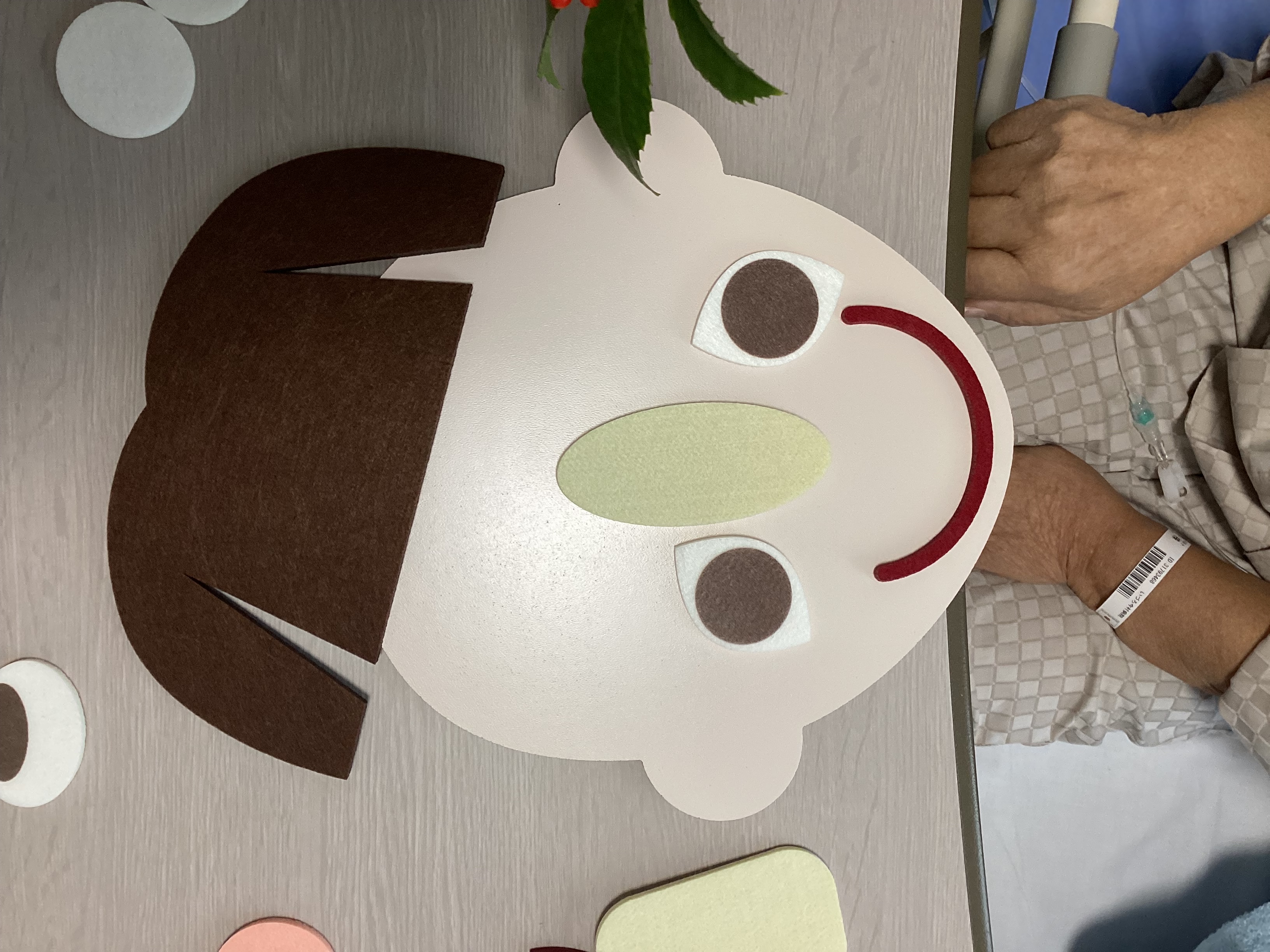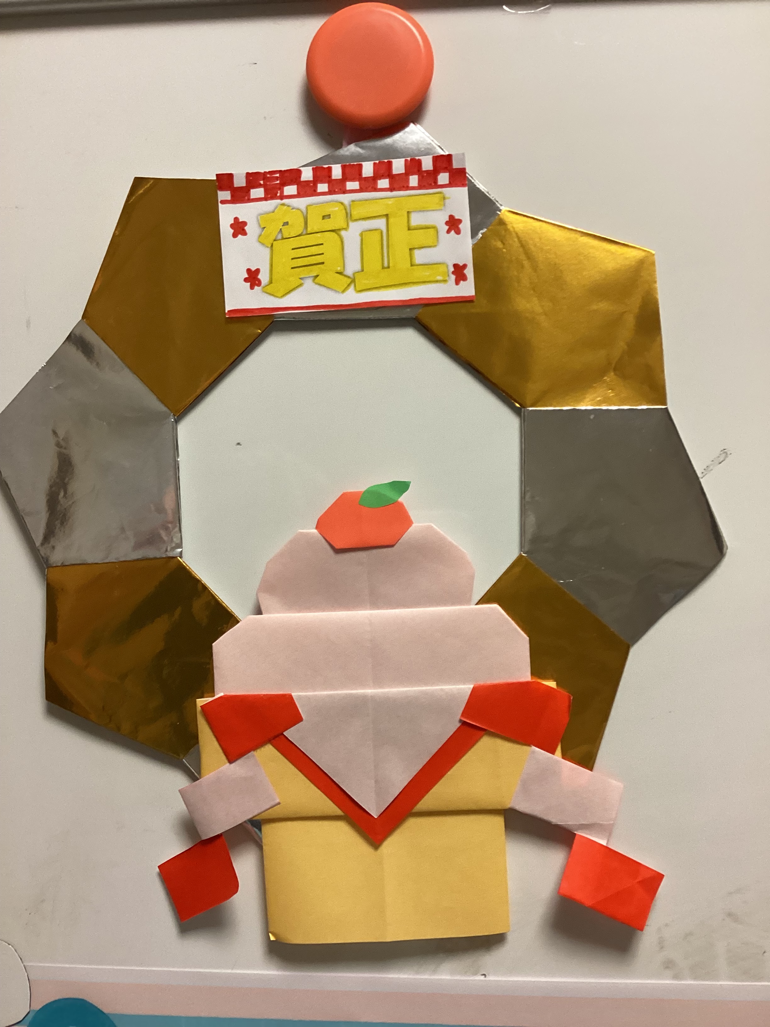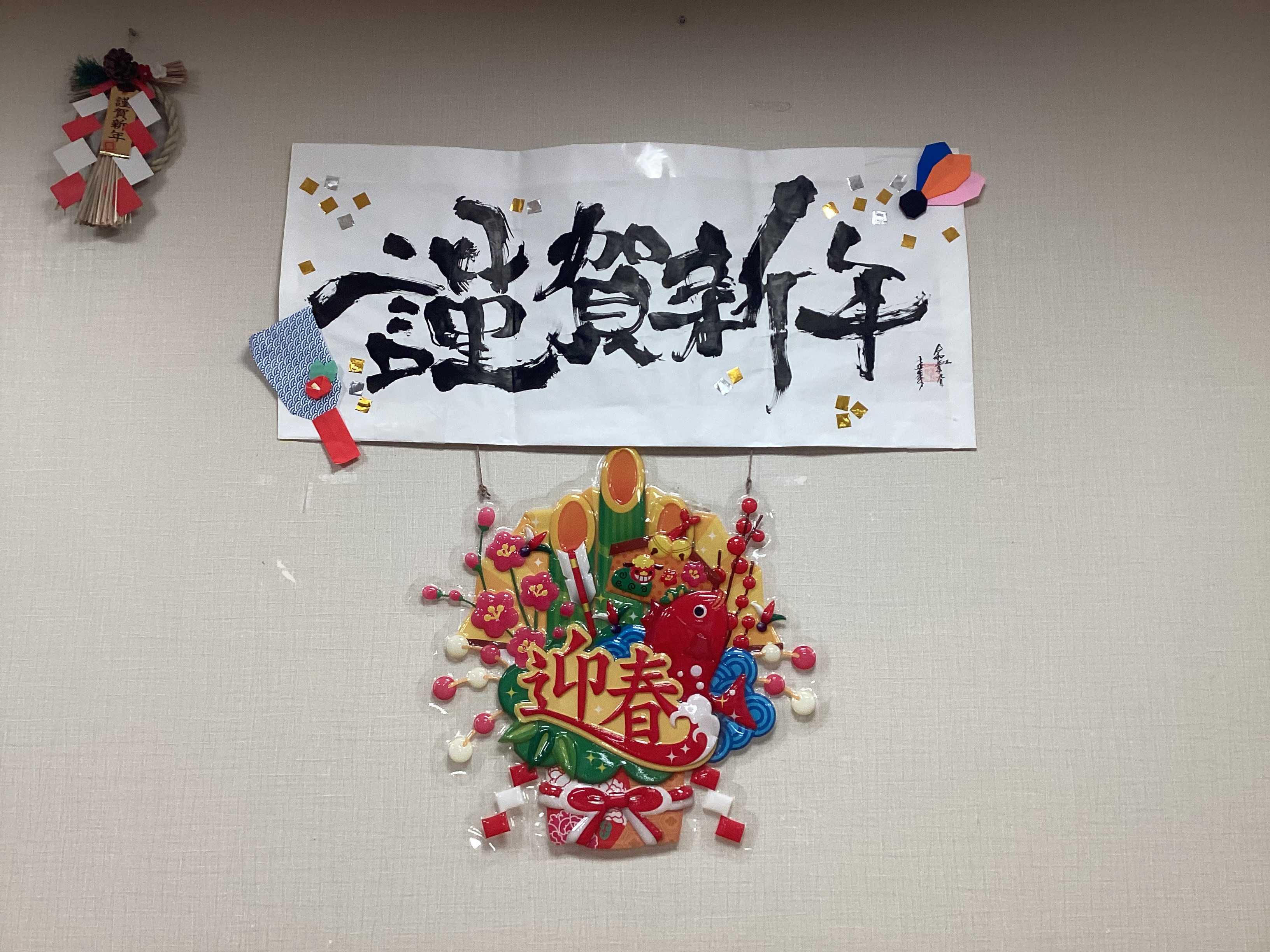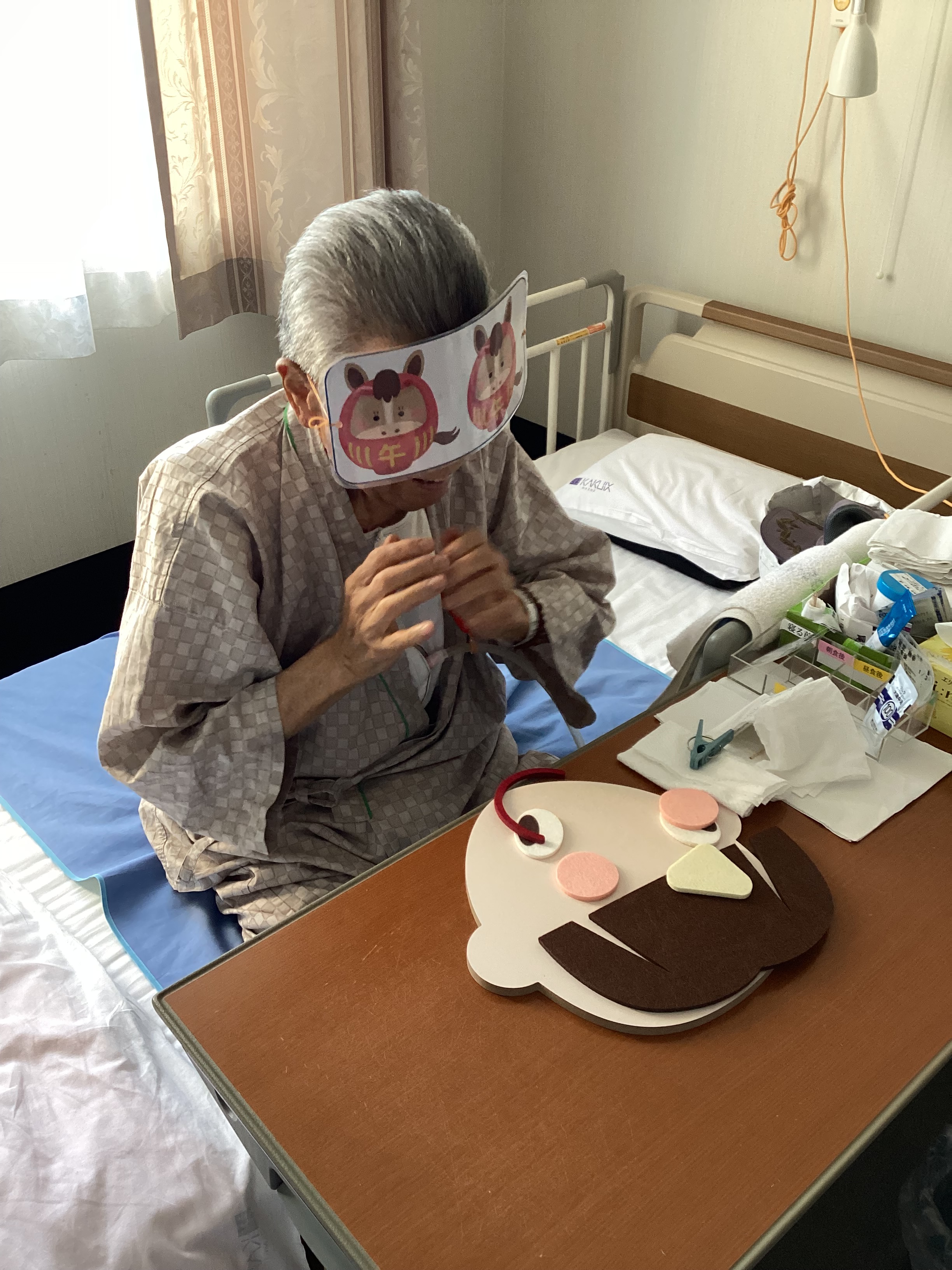 そして、クリスマスの余韻にひたる間もないままお正月へとシフト。元旦は桜島から登る初日の出を楽しまれる患者様もみられ、常食の方には昼食に松花堂弁当が振る舞われました。お部屋には折り紙で作成した鏡もちを飾り、エントランスや談話室も干支や縁起物が並び、お正月遊びとして患者様と【福笑い】も楽しみました。福笑い初挑戦の患者様もいましたが、中には「なつかしい」という声も聞かれ、皆さん真剣に取り組み、完成した顔を見て、年明け早々【初笑い】でした。