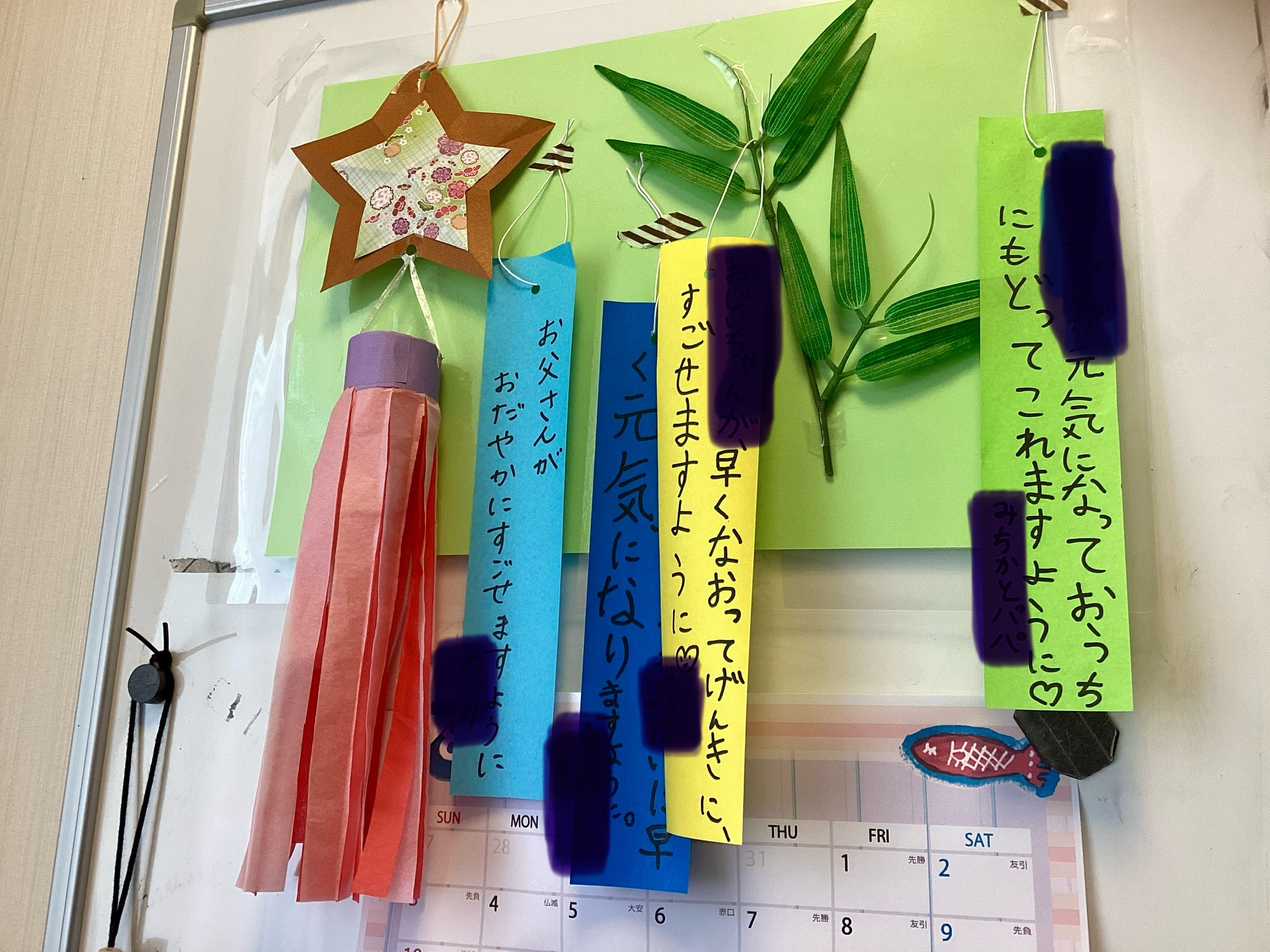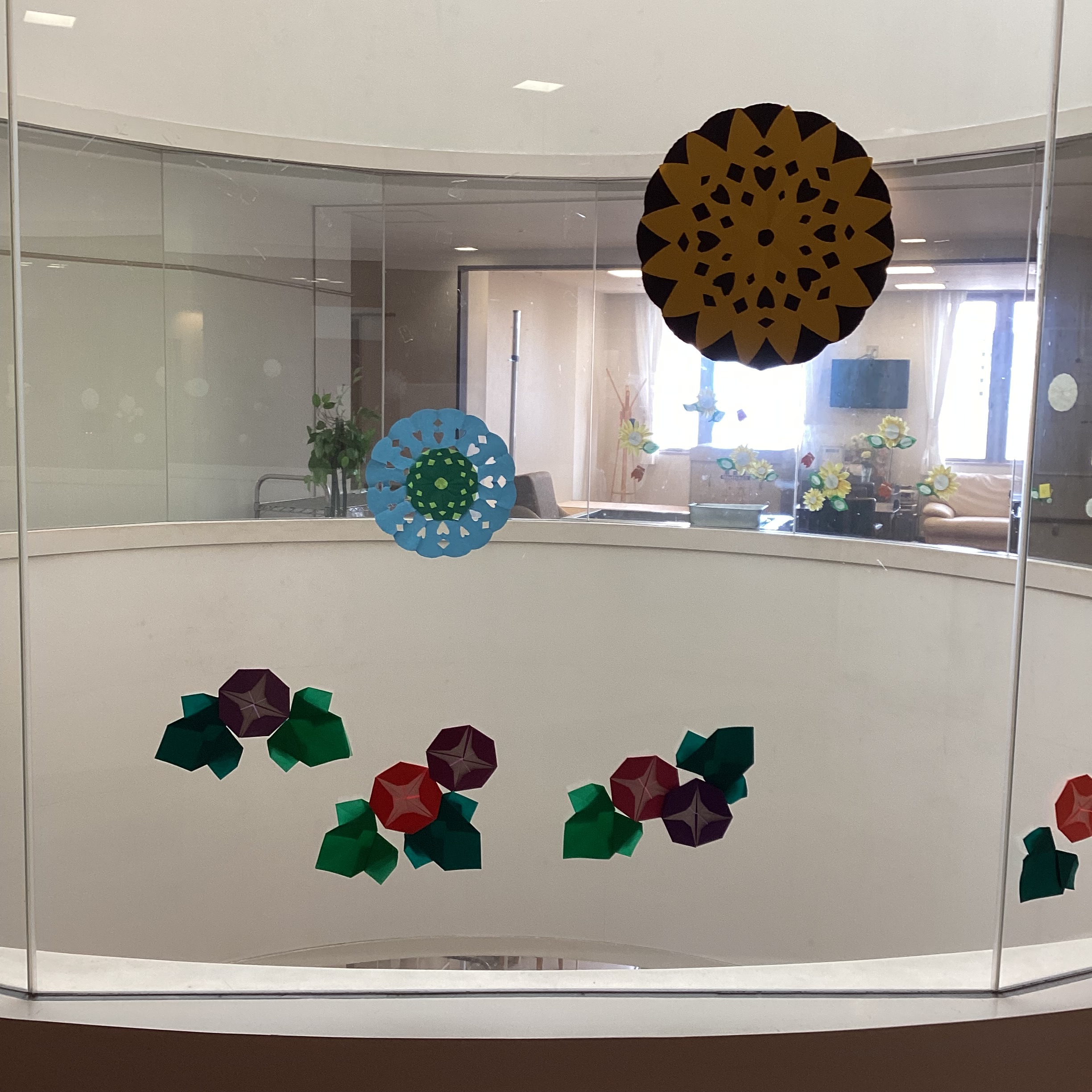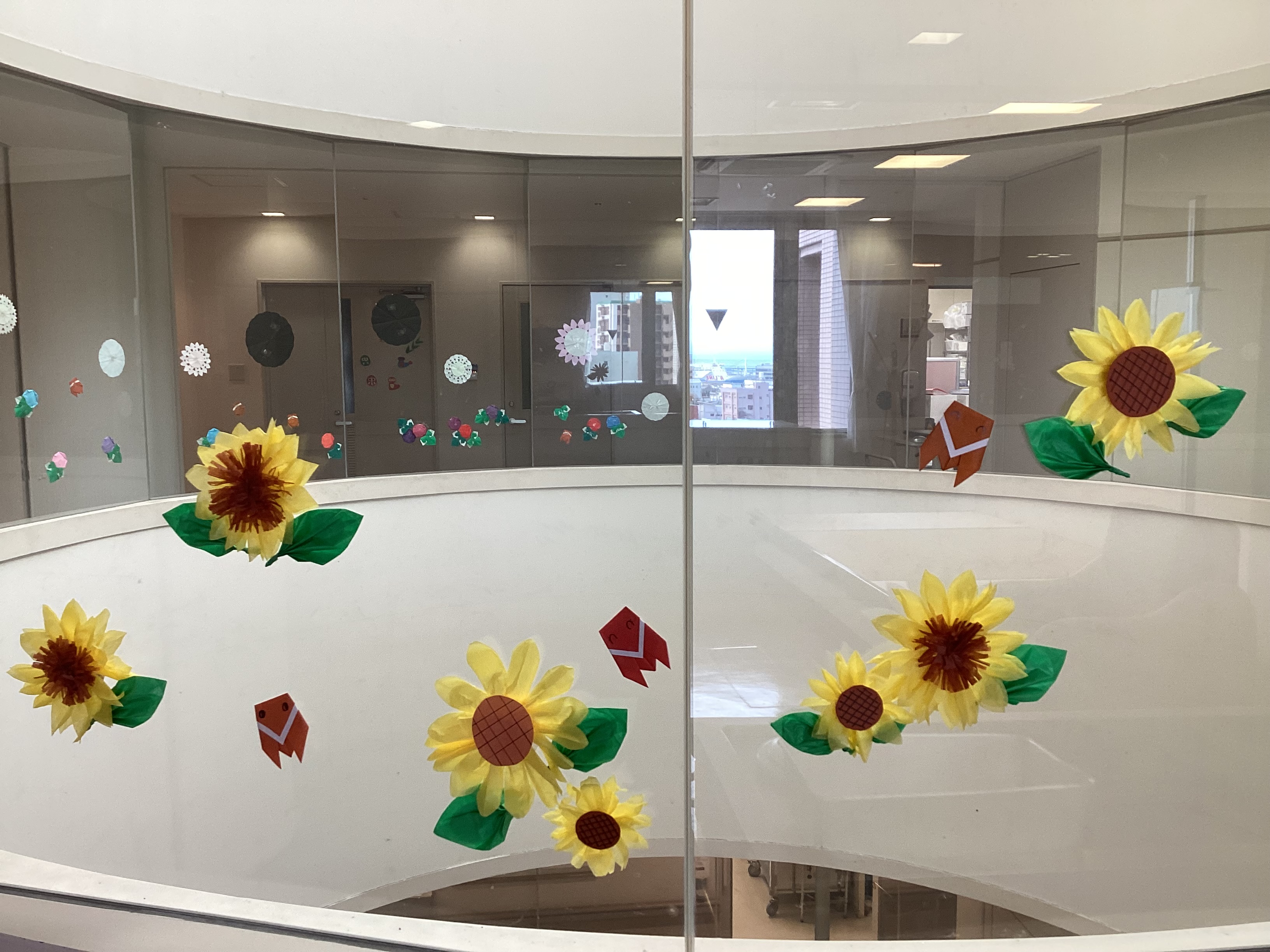 7月~8月、緩和ケア病棟のエントランスには、朝顔やヒマワリ、そして花火をイメージした作品を飾り夏を演出、また、病室には七夕飾りを飾り付けました。七夕の短冊を用意し、患者様ご本人だけでなく、ご家族様にも願いごとを書いてもらえるようにしたところ、願いを込められた短冊が下げられていました。きっと願いが届いたことでしょう。