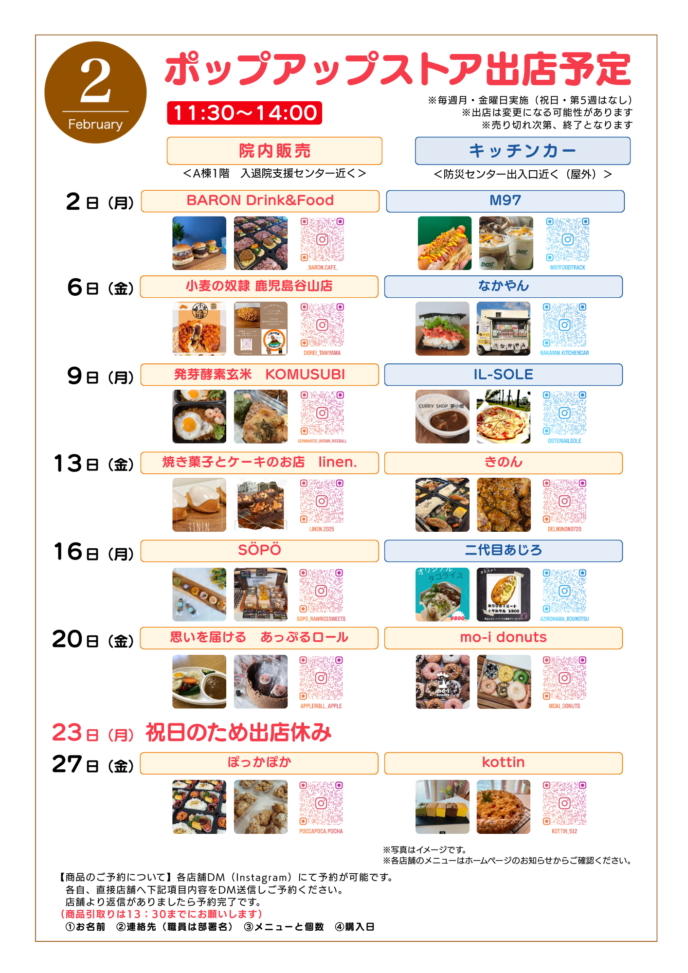 2月の出店スケジュールは以下のとおりです。