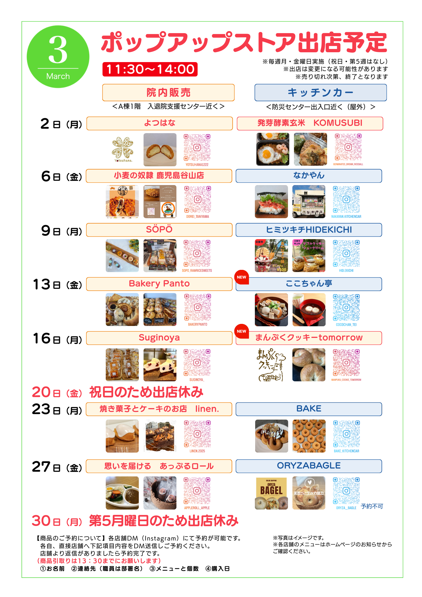 3月の出店スケジュールは以下のとおりです。