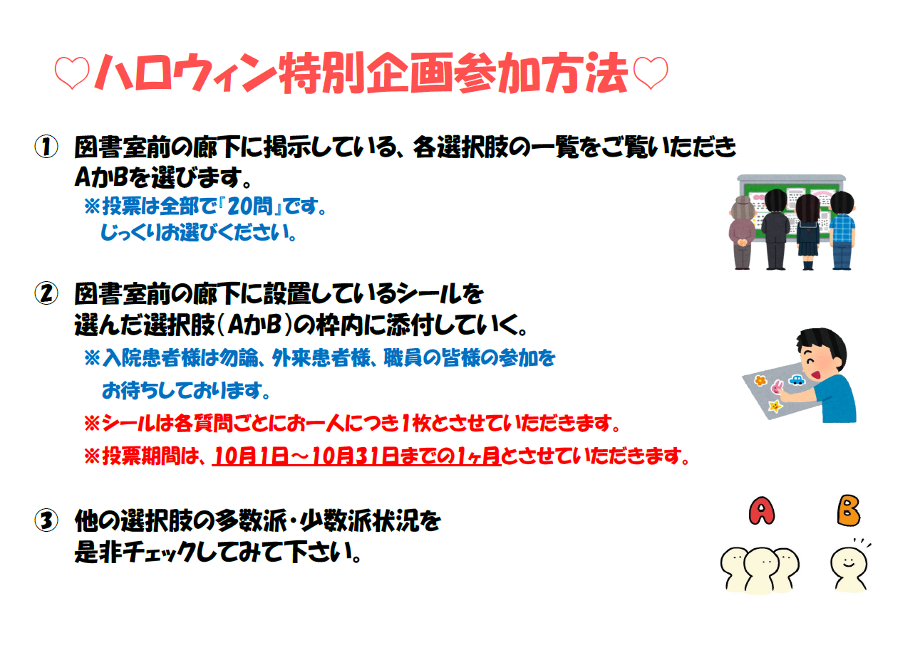 患者さま図書室では、入院中の方々、外来患者さま、そして職員も季節感を感じたり、気分転換を図ったりできるよう