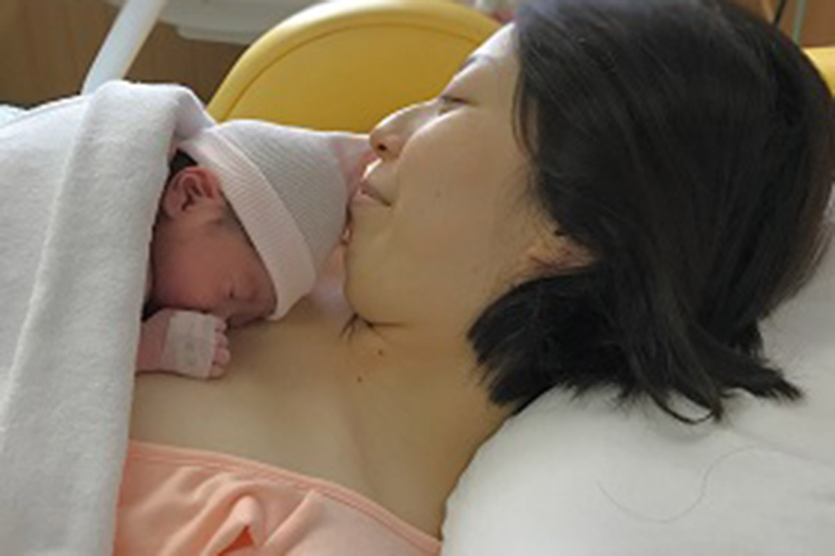 出産後、分娩台の上で寝ているお母さんの肌と、赤ちゃんの肌が直接触れ合うように抱っこしてもらいます。