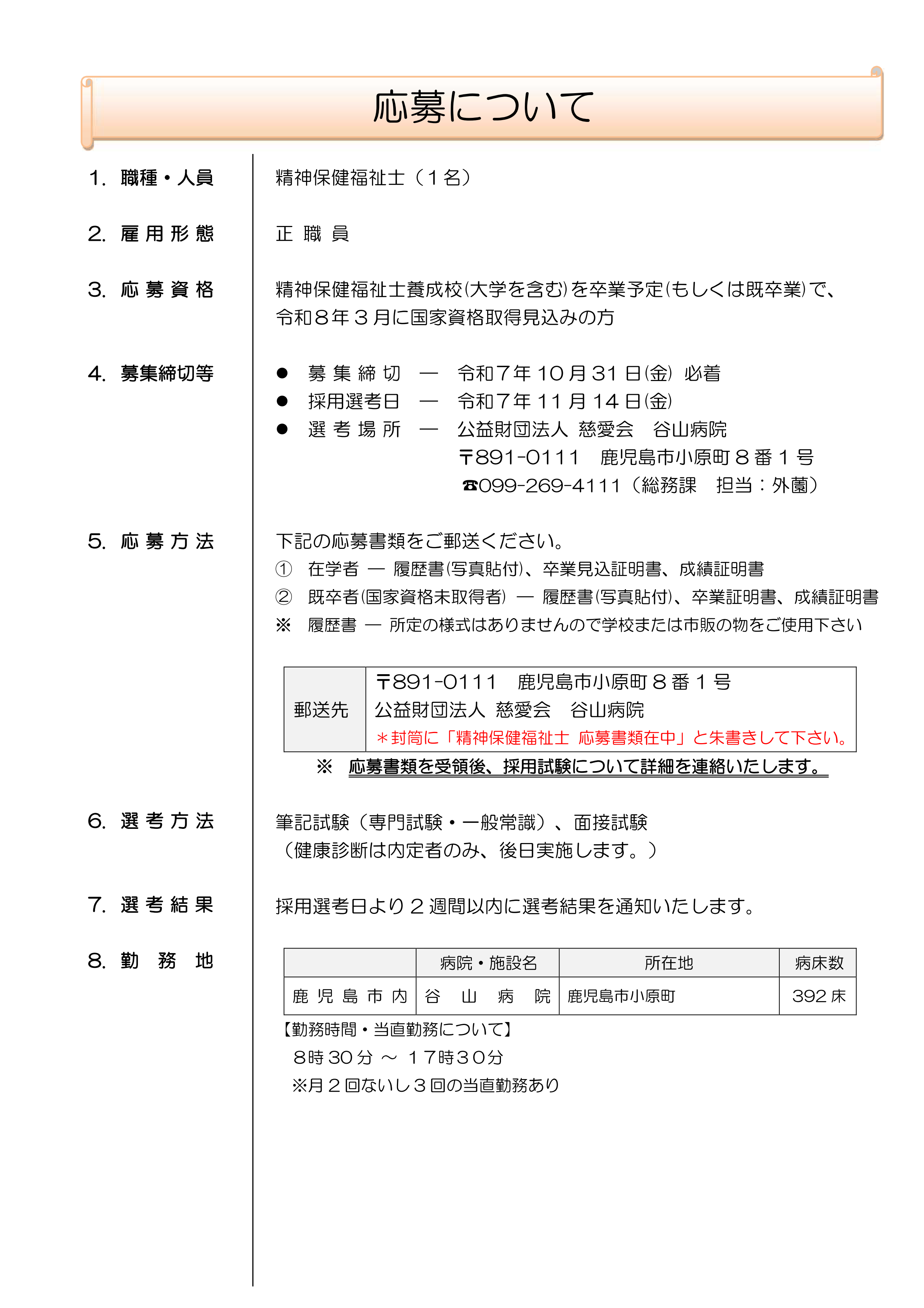 | 応募資格 | 精神保健福祉士の国家資格を取得している、令和7年に取得見込みの方