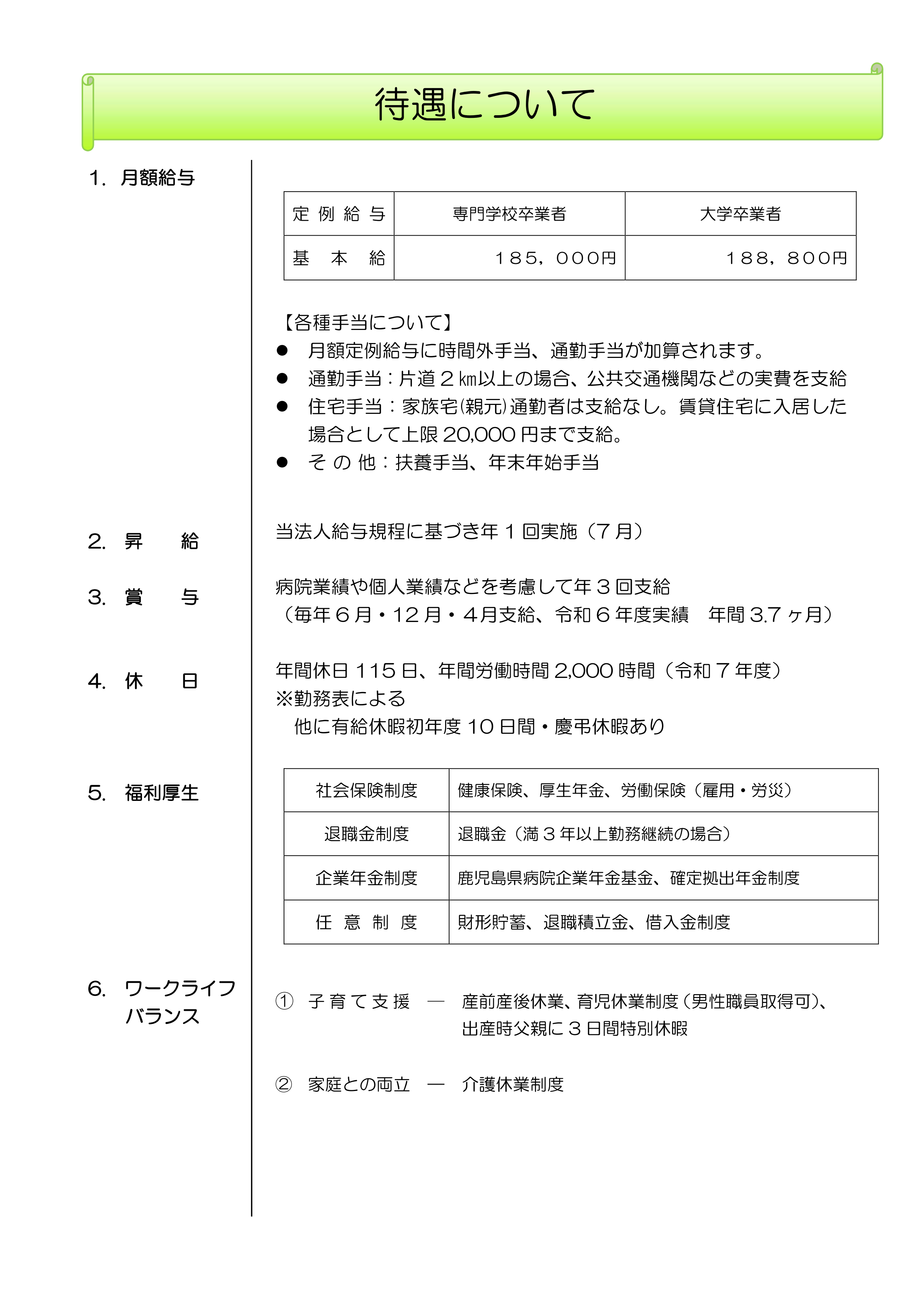 ・退職金制度あり(勤続年数3年以上) ・鹿児島県病院企業年金基金、財形貯蓄、退職積立金、借入金制度等 |