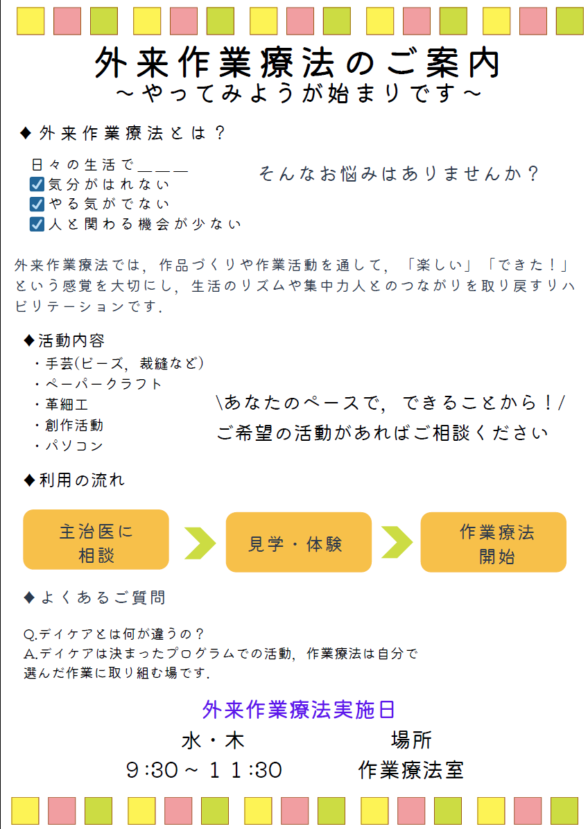 医師の指示のもと作業(趣味や学習など)を通して行うリハビリテーションです。趣味・創作・運動といったさまざまな活動を提供して、生活リズムの安定や生活能力の維持向上を図ることで、その人らしい生活が退院後も送れるようにサポートしています。(個人の能力やニーズにあわせて、調理や買い物・外出・公共施設の利用など生活支援にも力を入れています)